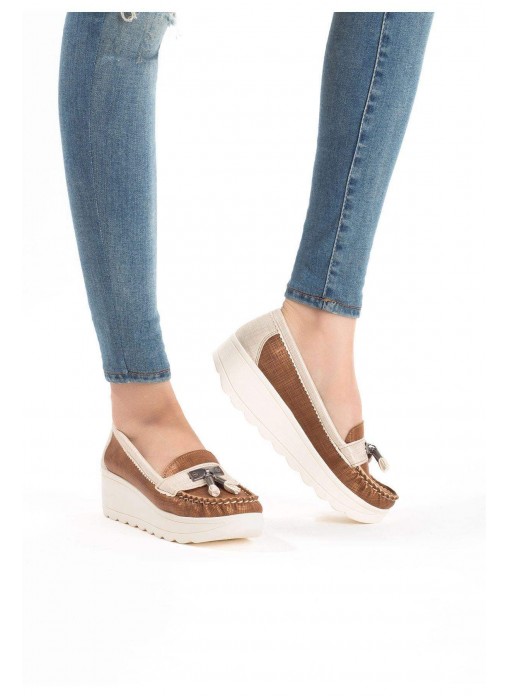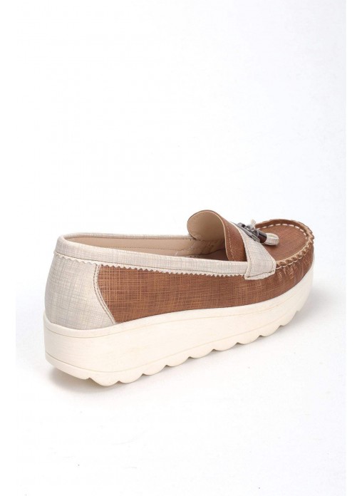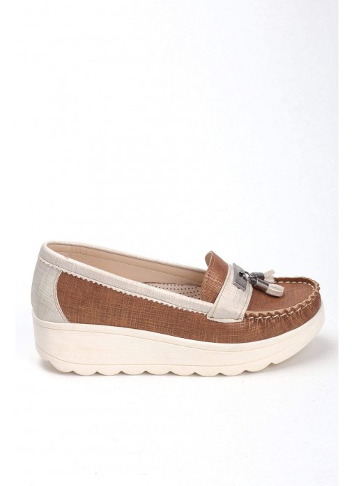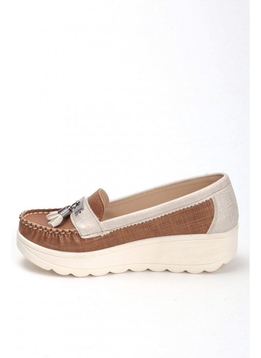 Renk/Detay: Taba Krem Püsküllü Bayan Dolgu Topuk Babet Ayakkabı Kalıp: Standart ayak ölçülerine göre Tam Kalıp Taban Ölçüsü: 4 cm Taban Materyali: Haızr Taban