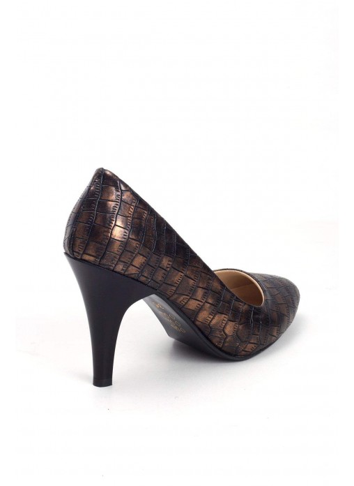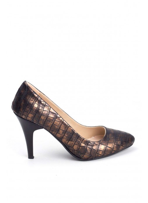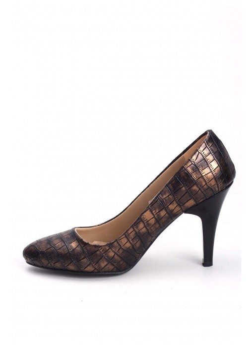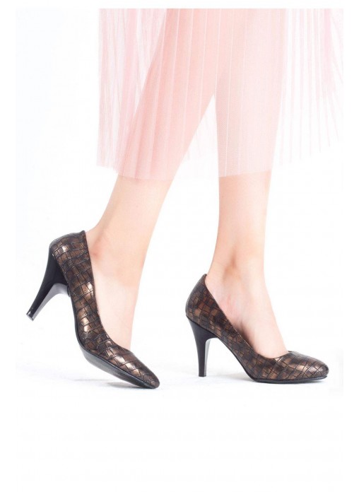 Renk/Detay: Bakır Desenli Bayan Stiletto Ayakkabı Kalıp: Standart ayak ölçülerine göre Tam Kalıp Topuk Boyu : 10 cm Taban Materyali: Neolit Taban