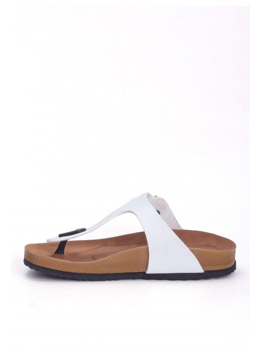 Renk/Detay: Beyaz Cilt Bayan Parmak Arası Kemerli Terlik Kalıp: Standart ayak ölçülerine göre Tam Kalıp Taban Yüksekliği : 2 cm Taban Materyali: Eva Taban
