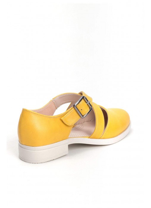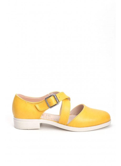 Renk/Detay: Sarı Cilt Çapraz Bantlı Kemerli Bayan Babet Ayakkabı Kalıp: Standart ayak ölçülerine göre Tam Kalıp Taban Materyali: Tpu Taban