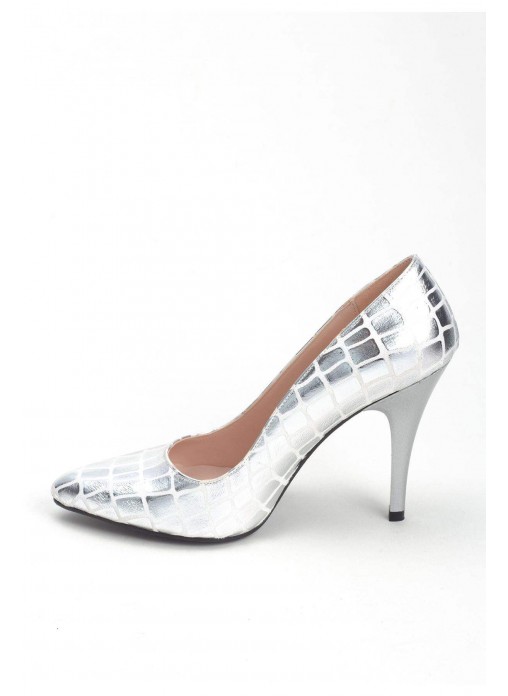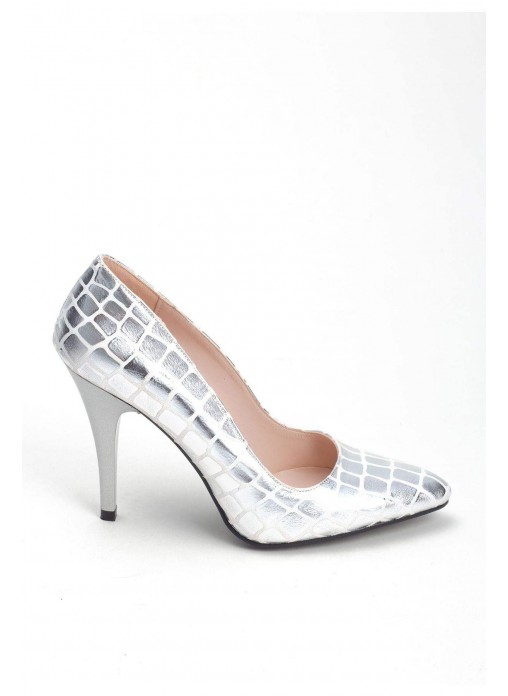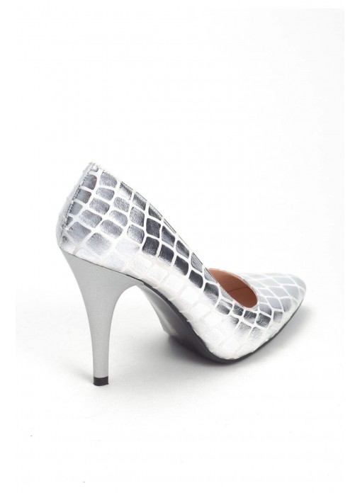 Renk/Detay: Gümüş Desenli Cilt Bayan Uzun Topuk Ayakkabı Kalıp: Standart ayak ölçülerine göre Tam Kalıp Topuk Boyu : 10 cm Taban Materyali: Neolit Taban