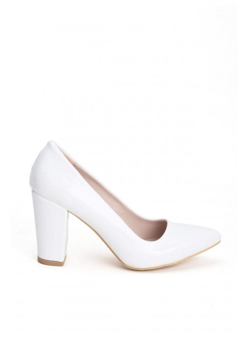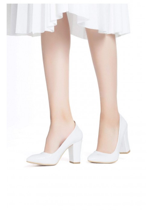 Renk/Detay: Beyaz Rugan Bayan Kalın Topuklu Ayakkabı Kalıp: Standart ayak ölçülerine göre Tam Kalıp Topuk Boyu : 9 cm Taban Materyali: Jurdan Taban