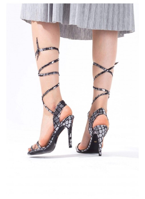 Renk/Detay: Metalik Gri Desenli Bağlamalı Bayan Stiletto Ayakkabı Kalıp: Standart ayak ölçülerine göre Tam Kalıp Topuk Boyu: 11 cm Taban Materyali: Neolit Taban