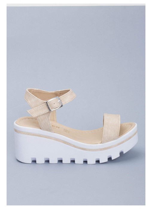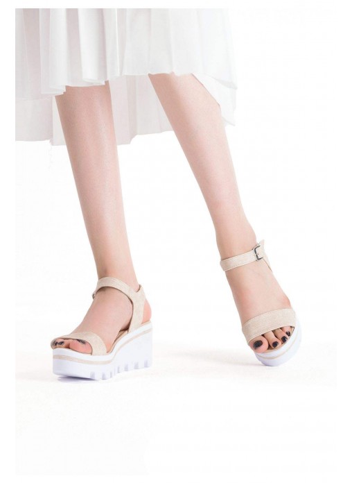 Renk/Detay: Krem Cilt Bayan Dolgu Topuk Sandalet Ayakkabı Kalıp: Standart ayak ölçülerine göre Tam Kalıp Topuk Boyu : 6,5 cm Taban Materyali: Termo Taban