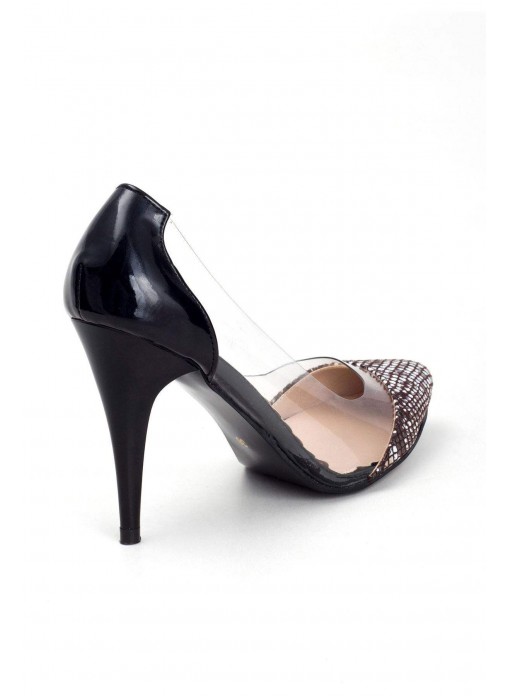 Renk/Detay: Siyah Rugan Desenli Burun Yanlar Şeffaf Bayan Stiletto Ayakkabı Kalıp: Standart ayak ölçülerine göre Tam Kalıp Açıklama: Ürünün Yanları Şeffaf, Burun Kısmı Desenli Topuk Boyu : 10 cm Taban Materyali: Neolit Taban