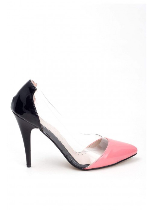 Renk/Detay: Siyah Rugan Pembe Burunlu Yanlar Şeffaf Bayan Stiletto Ayakkabı Kalıp: Standart ayak ölçülerine göre Tam Kalıp Açıklama: Ürünün Yanları Şeffaf, Burun Kısmı Pembe Topuk Boyu : 10 cm Taban Materyali: Neolit Taban