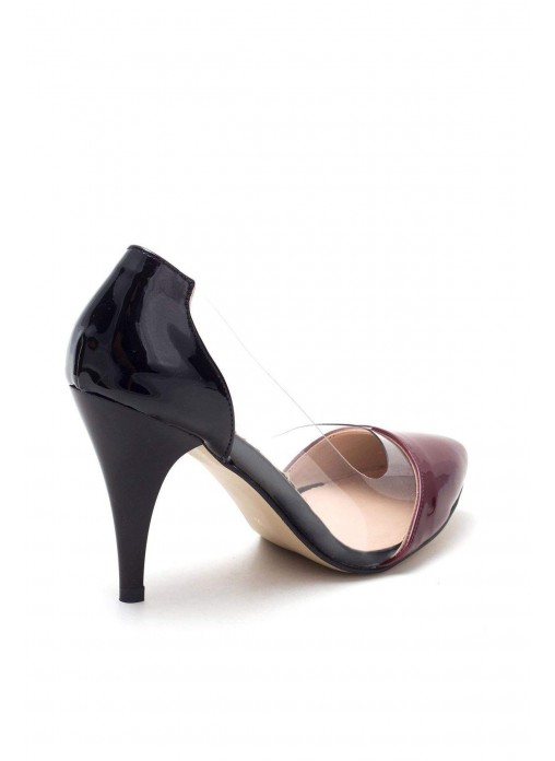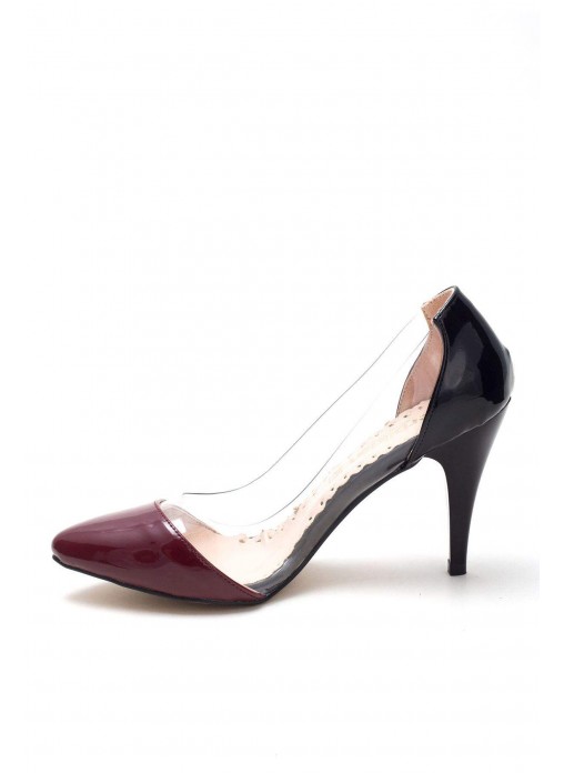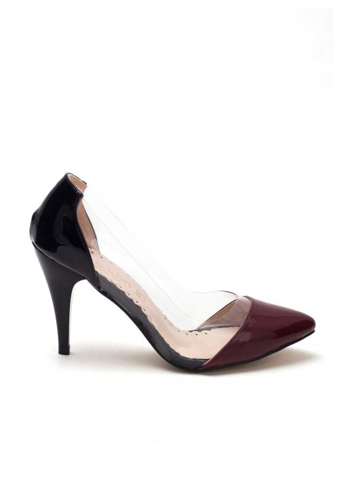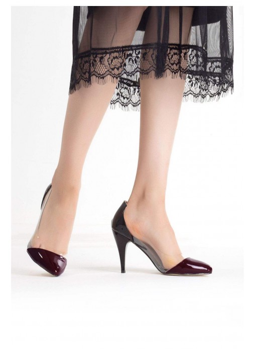 Renk/Detay: Siyah Rugan Bordo Burunlu Yanlar Şeffaf Bayan Stiletto Ayakkabı Kalıp: Standart ayak ölçülerine göre Tam Kalıp Açıklama: Ürünün Yanları Şeffaf, Burun Kısmı bordo Topuk Boyu : 9 cm Taban Materyali: Neolit Taban