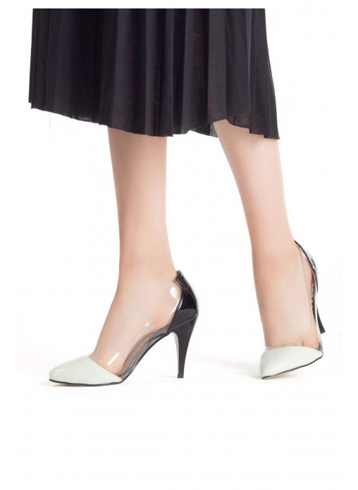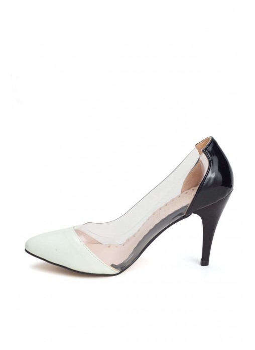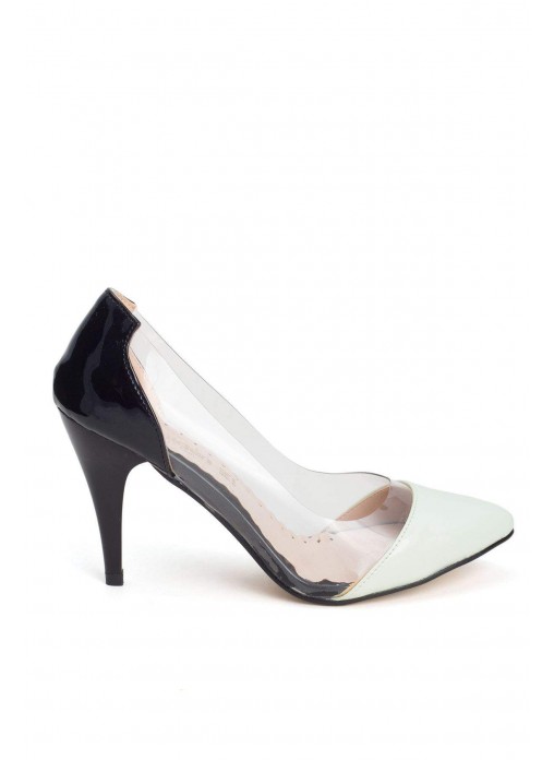 Renk/Detay: Siyah Rugan Su Yeşili Burunlu Yanlar Şeffaf Bayan Stiletto Ayakkabı Kalıp: Standart ayak ölçülerine göre Tam Kalıp Açıklama: Ürünün Yanları Şeffaf, Burun Kısmı Su Yeşili Topuk Boyu : 9 cm Taban Materyali: Neolit Taban