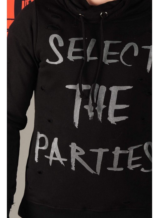 Bağcıklı Yaka Baskılı Sweat Siyah