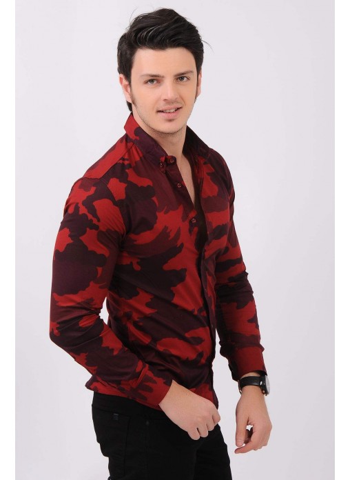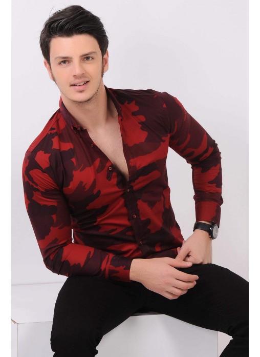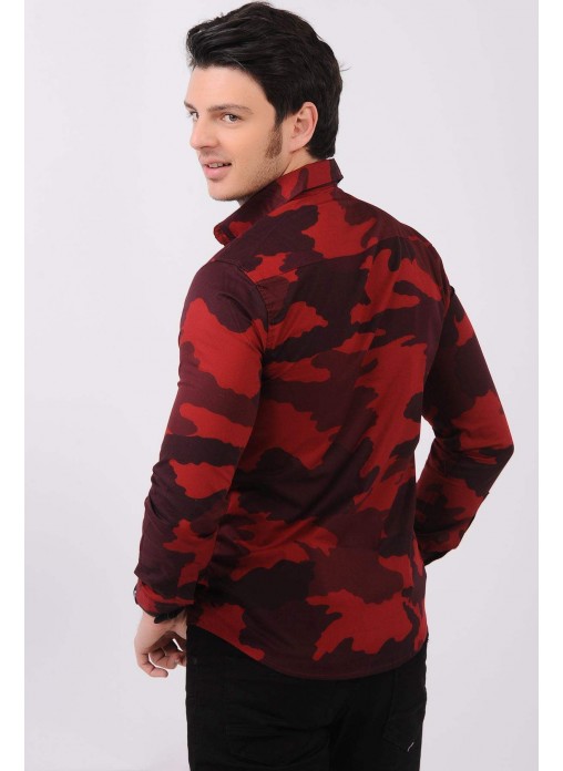 Kesim Tipi : Slim Fit Bordo Kırmızı Kamuflaj Gömlek