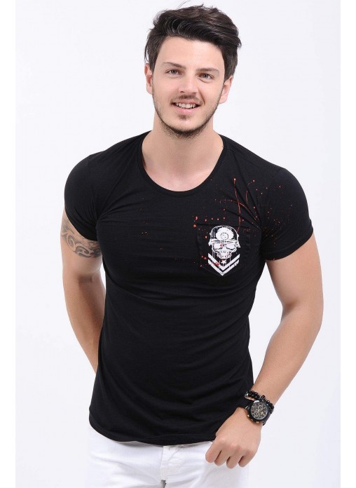 Cep Püskürtme Baskılı Siyah T-Shirt