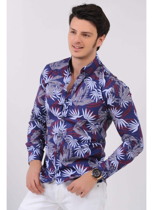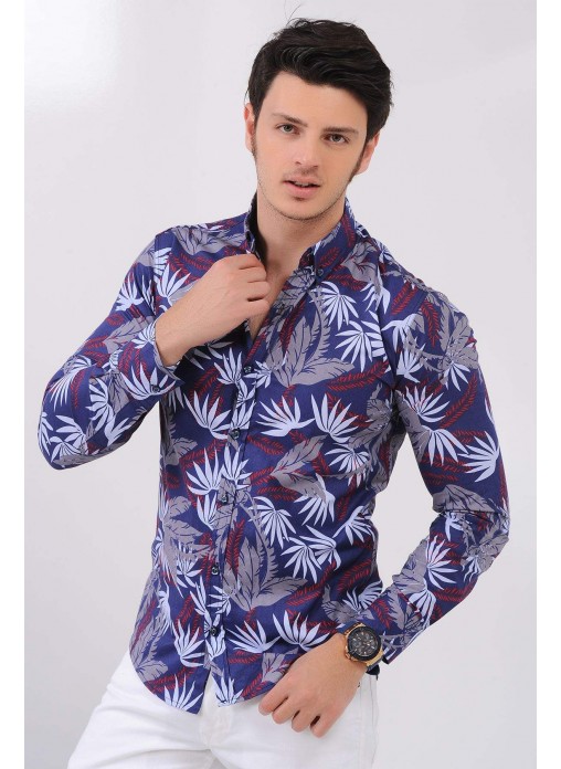 Kesim Tipi : Slim Gri Beyaz Yaprak Desenli Lacivert Gömlek