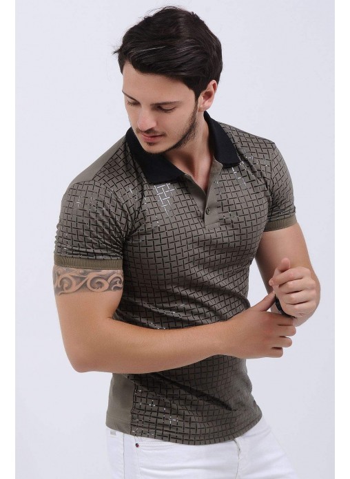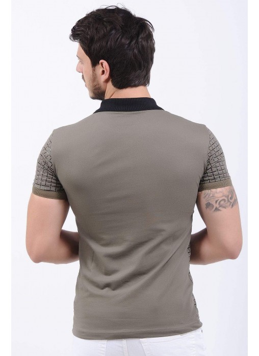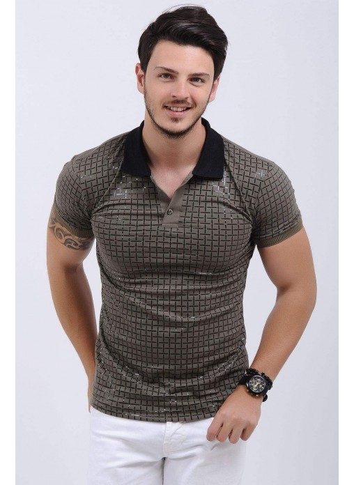 Kabartma Desenli Polo Yaka Haki T-Shirt