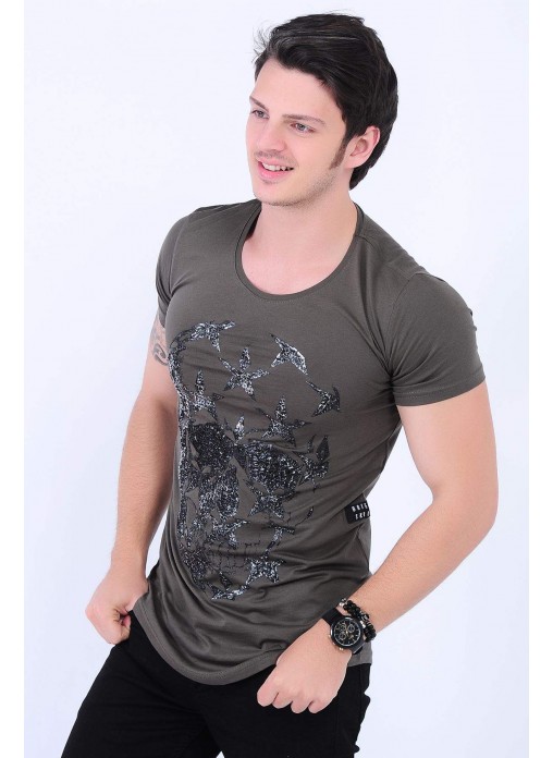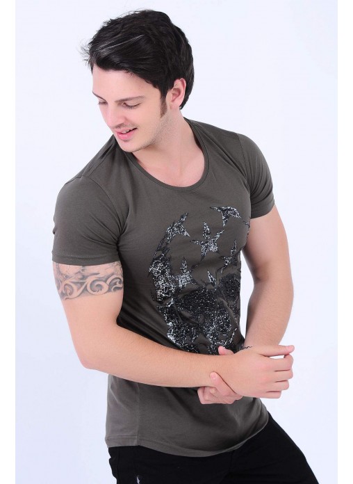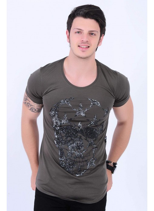 Kesim Tipi : Slim Fit Kamuflaj Kurukafa Baskılı Haki T-shirt