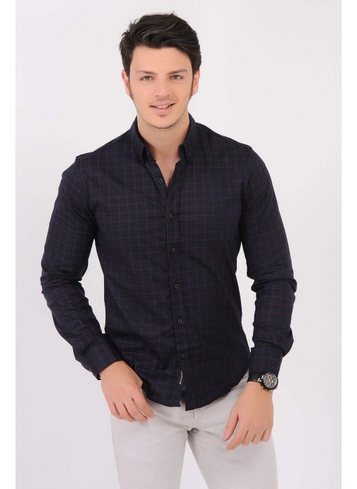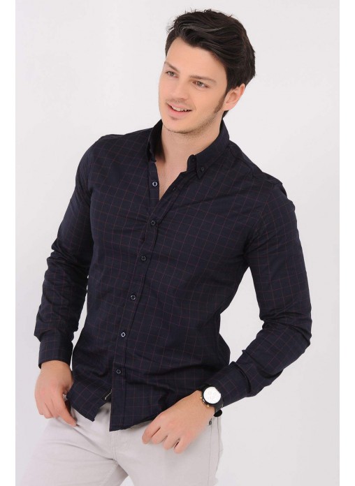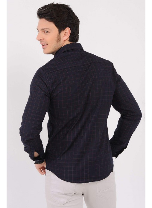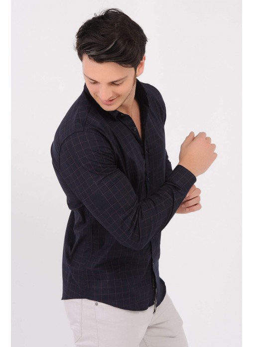 Kesim Tipi : Slim Fit Kırmızı Kare Çizgili Lacivert Gömlek