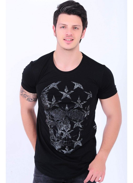 Kesim Tipi : Slim Fit Kuru Kafa Kabartma Baskılı Siyah T-Shirt