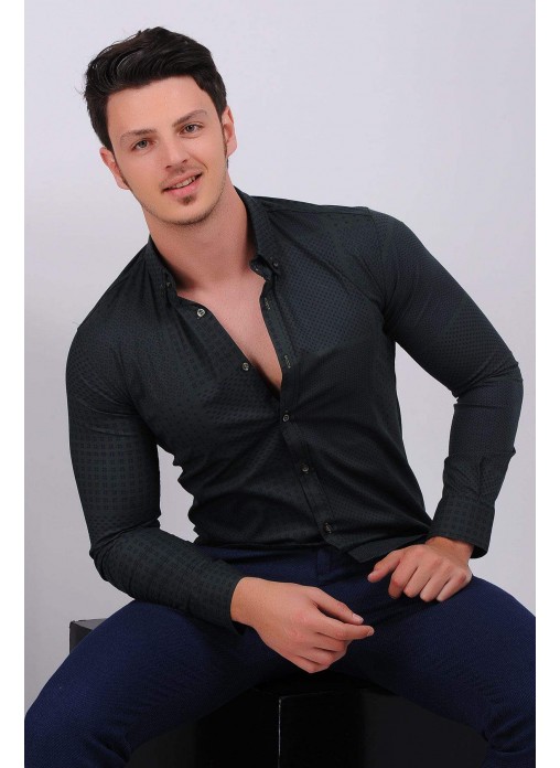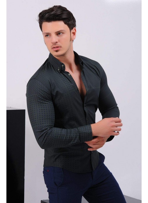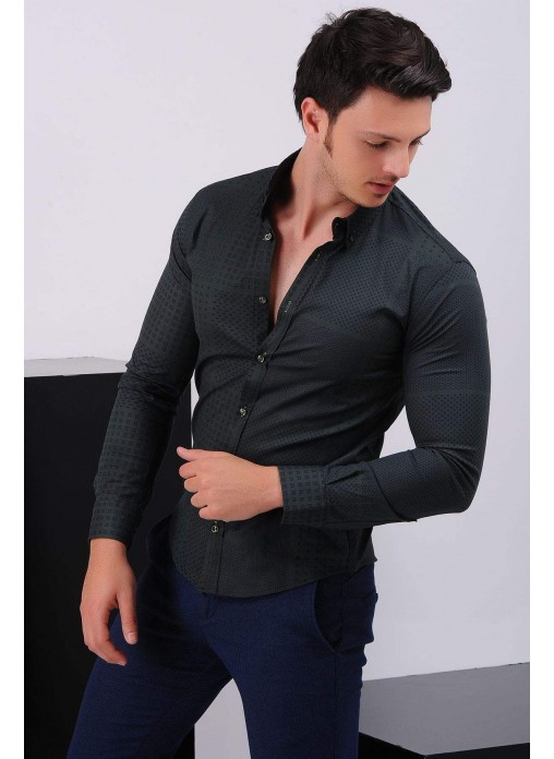 Kesim Tipi : Slim Fit Lacivert Desenli Haki Gömlek