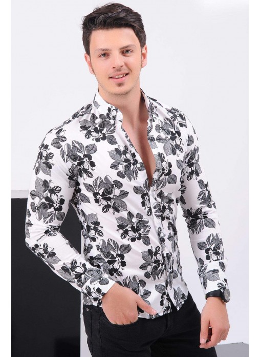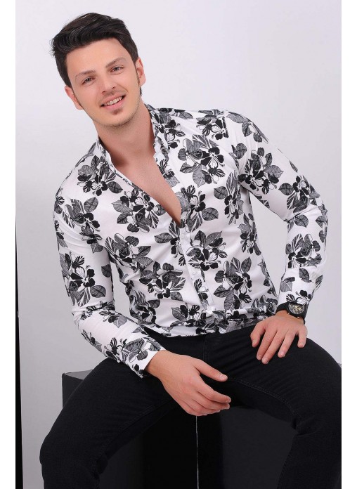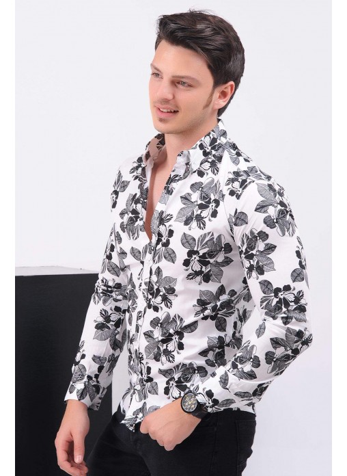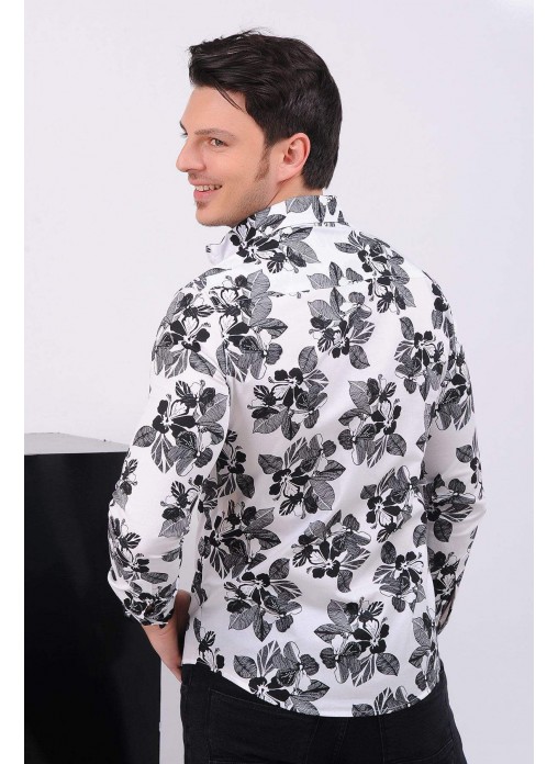 Kesim Tipi : Slim Fit Siyah Çiçek Desenli Beyaz Gömlek