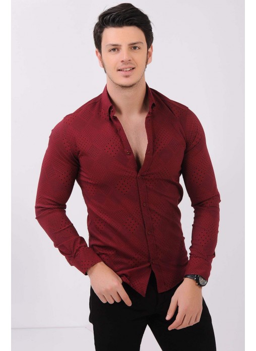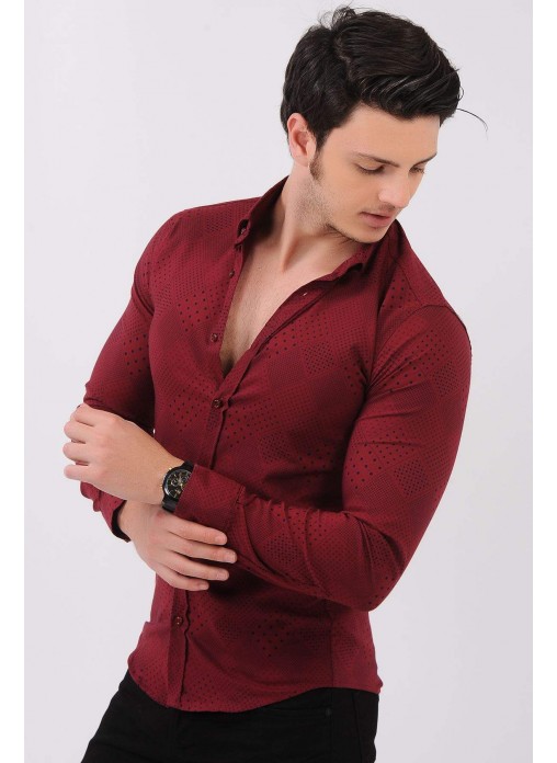 Kesim Tipi : Slim Fit Siyah Noktacık Desenli Bordo Gömlek