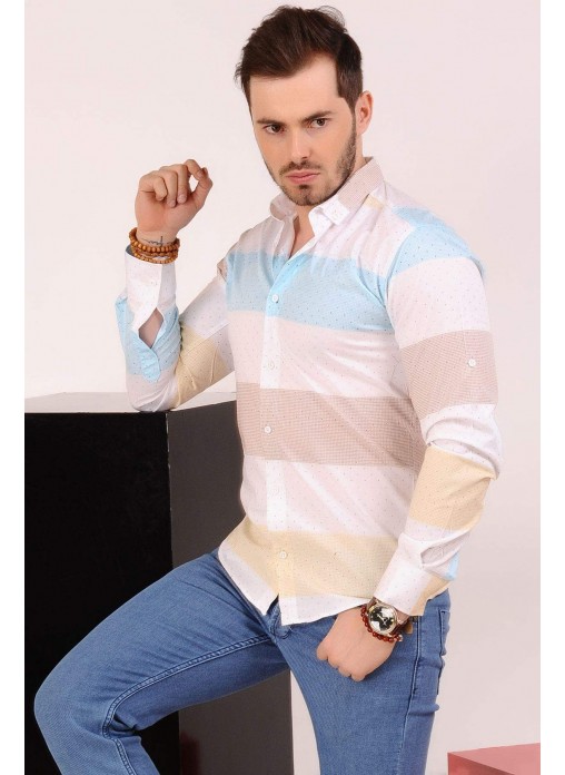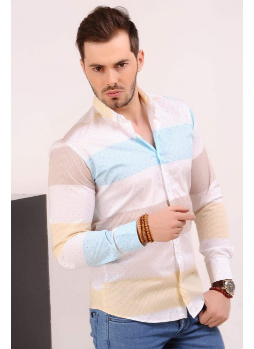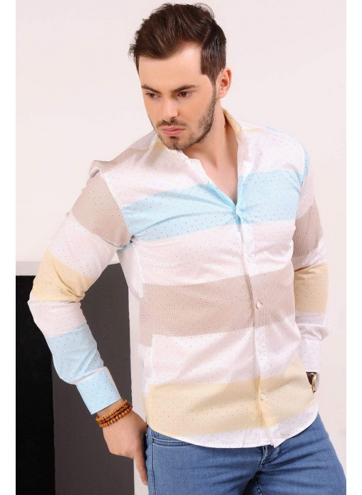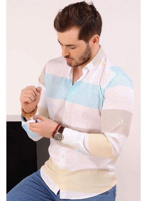 Turkuaz Kahve Şeritli Benekli Beyaz Gömlek