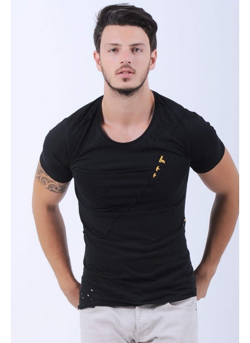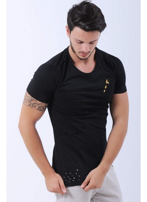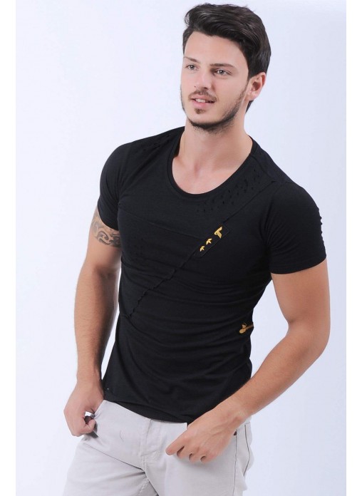 Kesikli Armalı Siyah T-Shirt