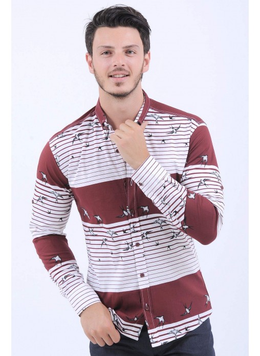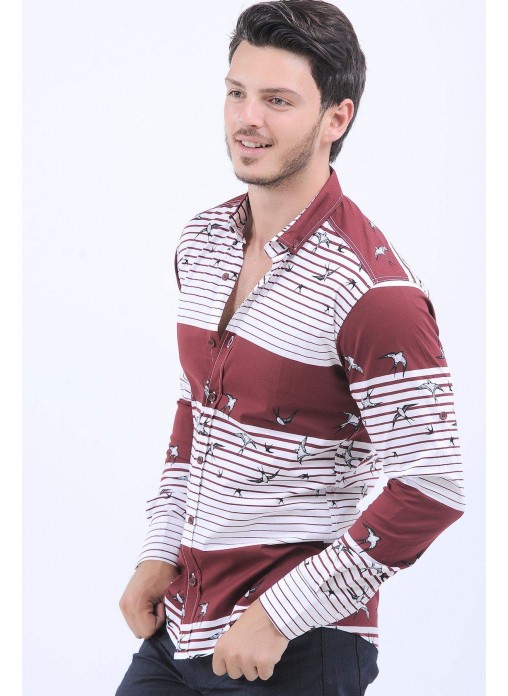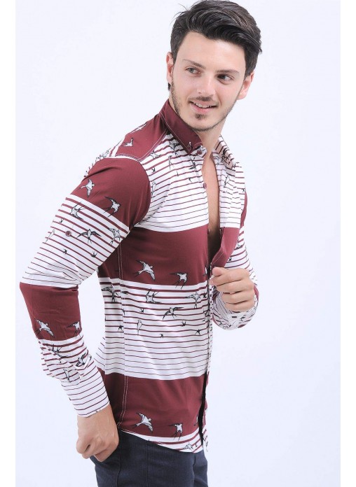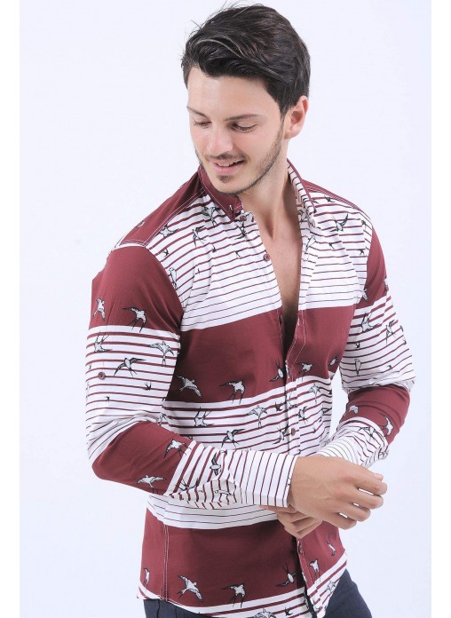 Kuş Desen Bordo Beyaz Gömlek