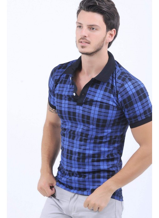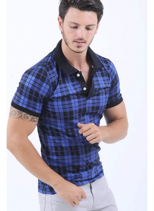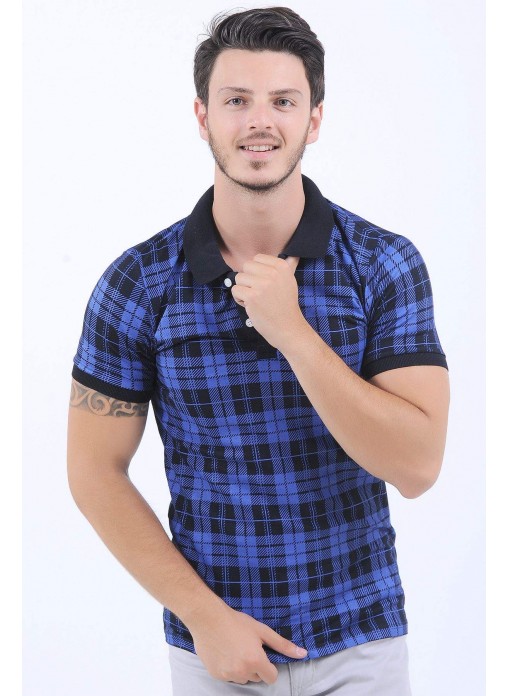 Siyah Kare Desen Polo Yaka Saks Mavisi T-Shirt
