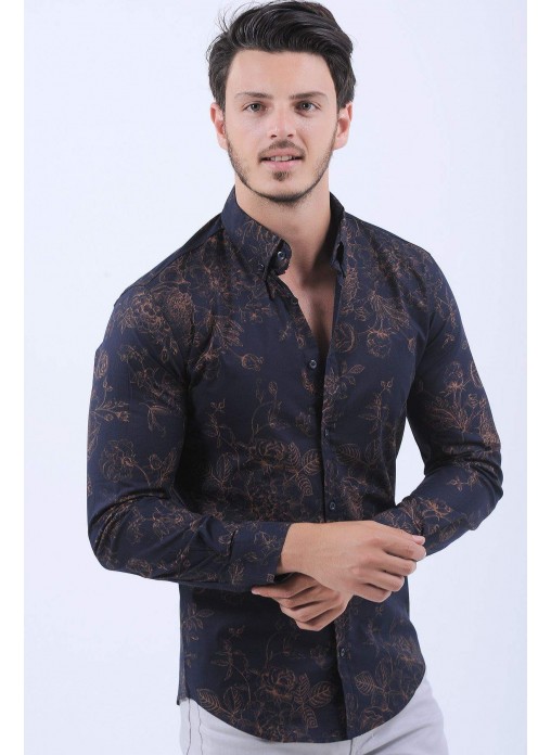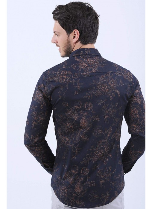 Turuncu Çiçek Desen Lacivert Gömlek