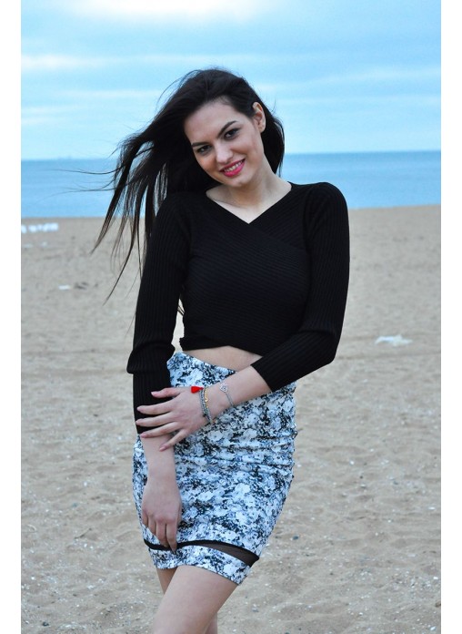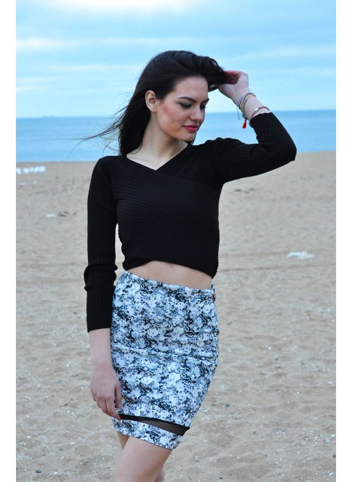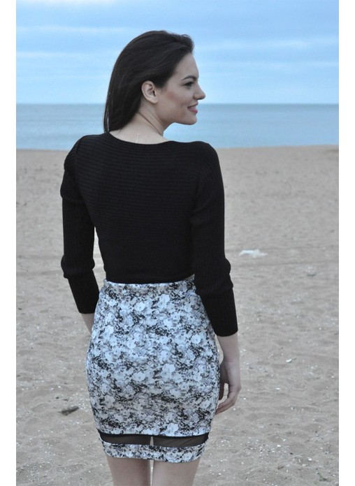 Omuz Açık Çiçek Desenli Geniş Etek Siyah Elbise