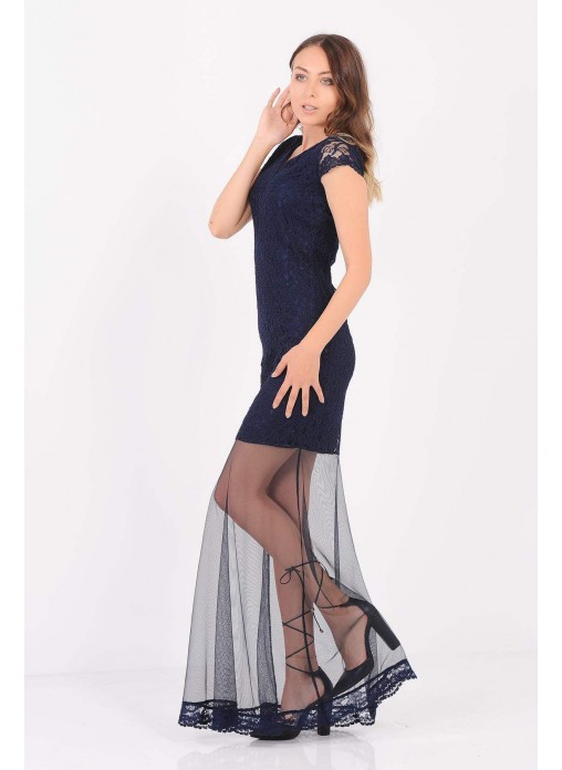 Bebe Kol Tül Etek Dantel Lacivert Abiye