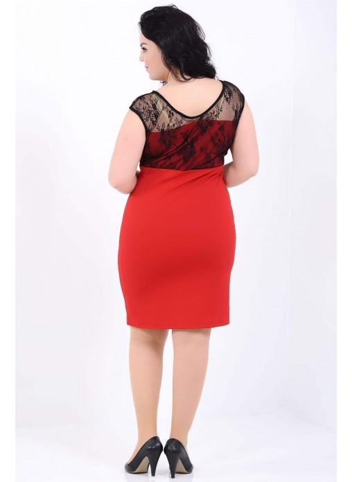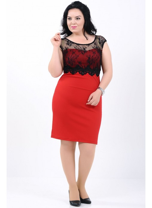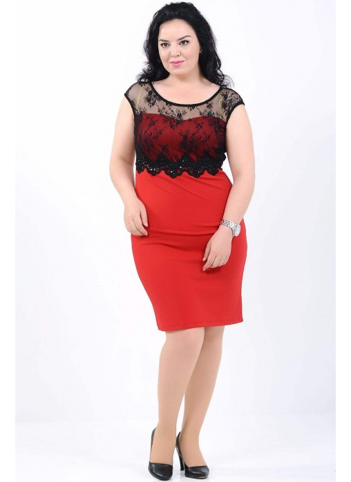 Beli Taşlı Şerit Dantel Detay Büyük Beden Kırmızı Elbise