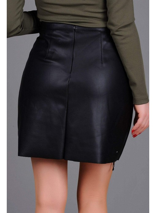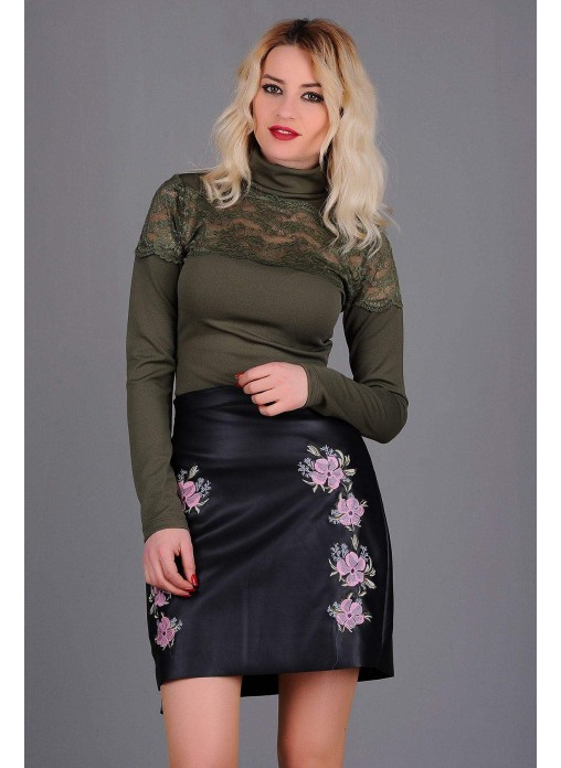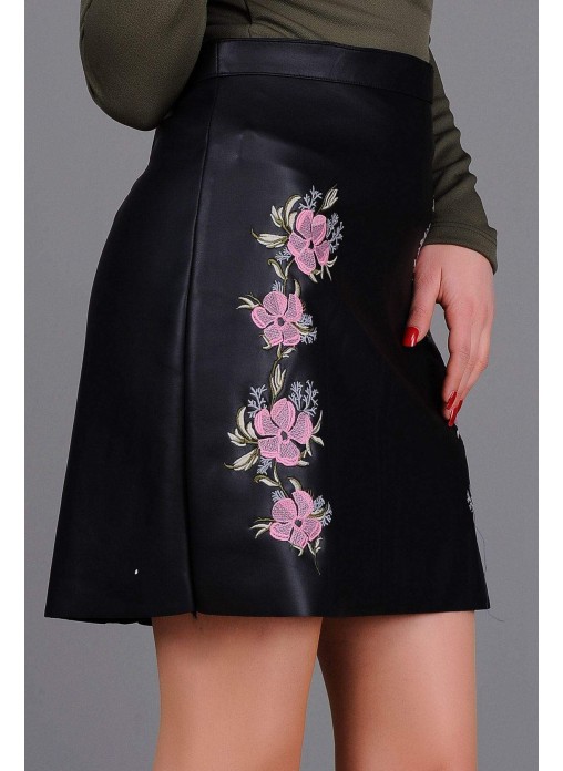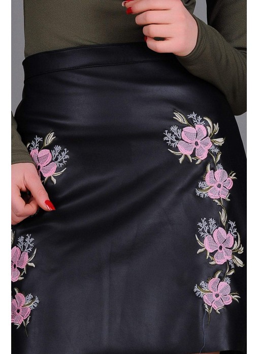 Çiçek İşlemeli Deri Etek