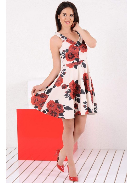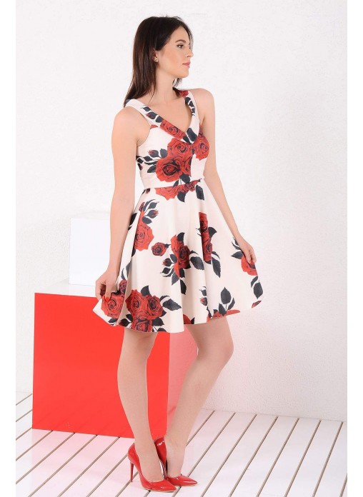Kesim Tipi : Gül Desenli Kalp Yaka Beyaz Elbise