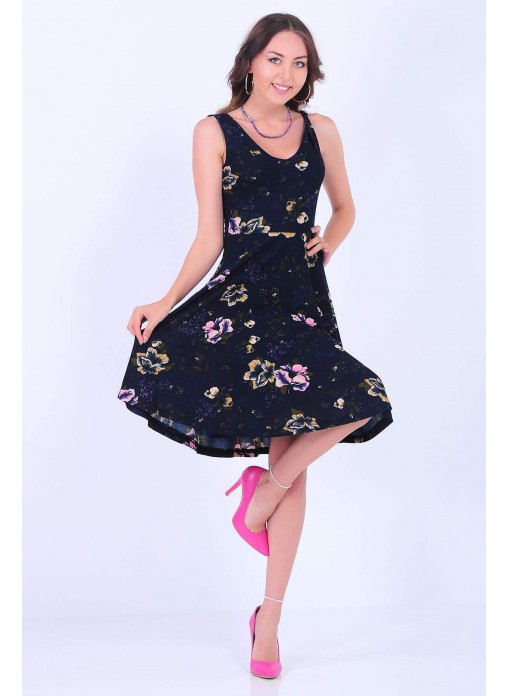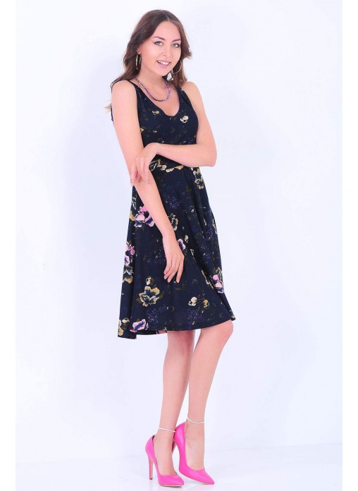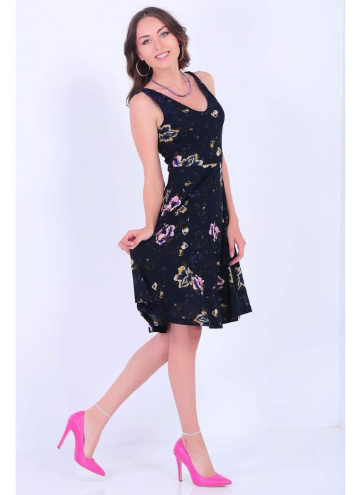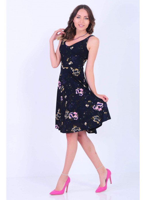 Kalp Yaka Çiçek Desenli Geniş Etek Lacivert Elbise