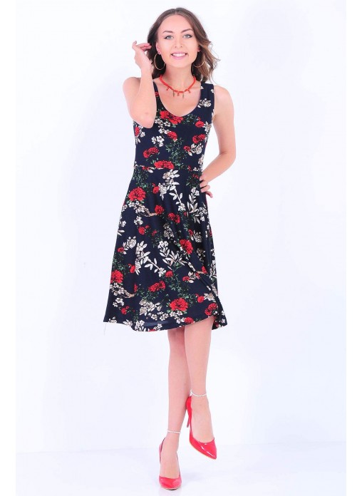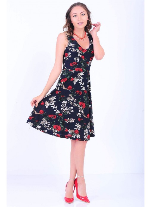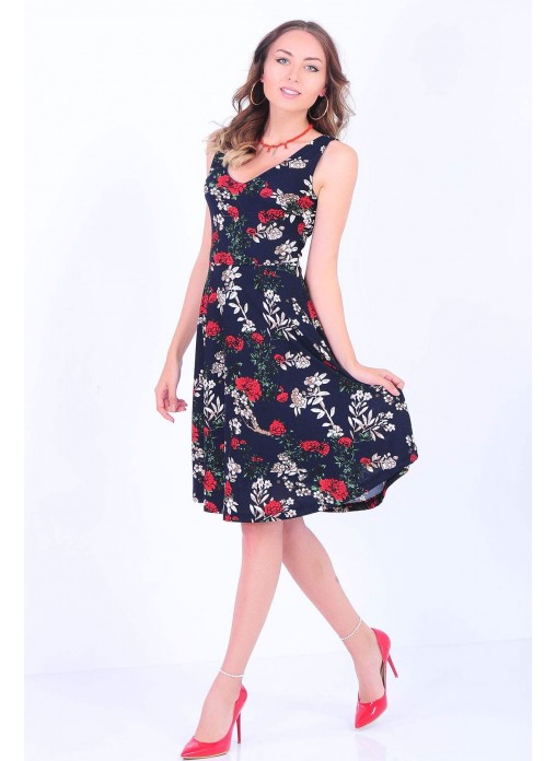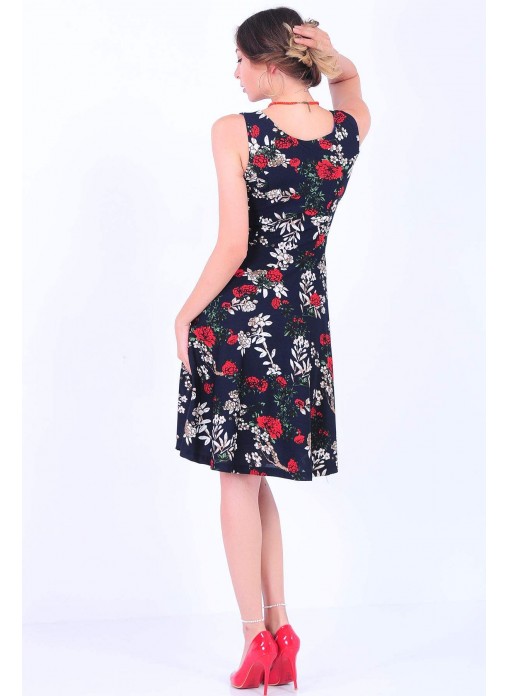 Kalp Yaka Çiçek Desenli Geniş Etek Lacivert Elbise