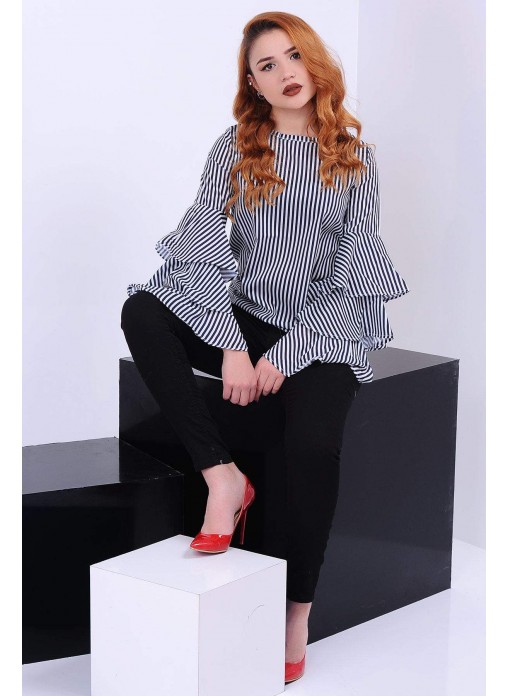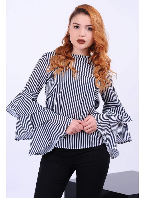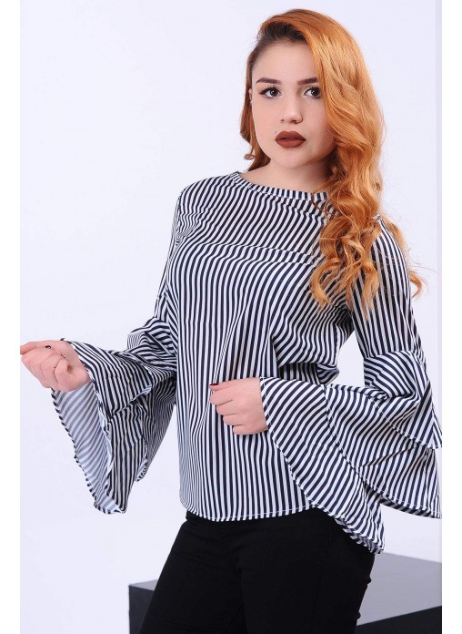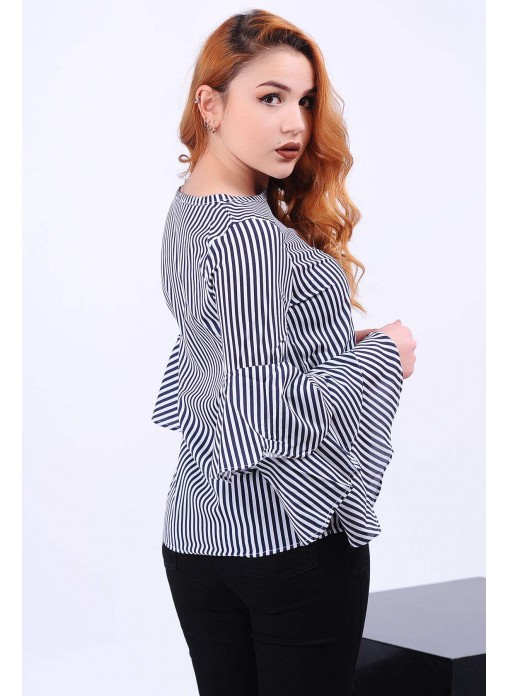 Katlı Volanlı Kol Çizgili Siyah Beyaz Bluz