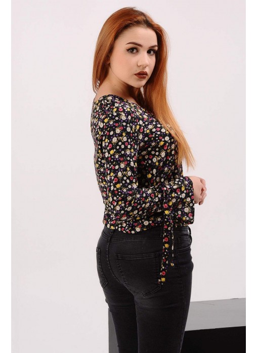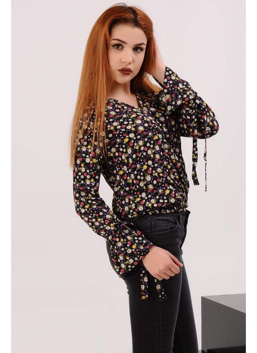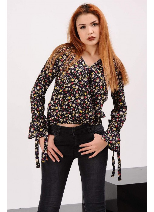 Kol Bağcıklı Çiçekli Siyah Bluz