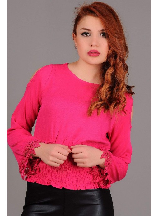 Kol Dantel Küpürlü Omuz Açık Fuşya Bluz