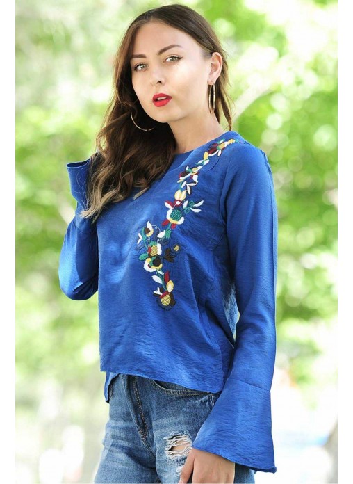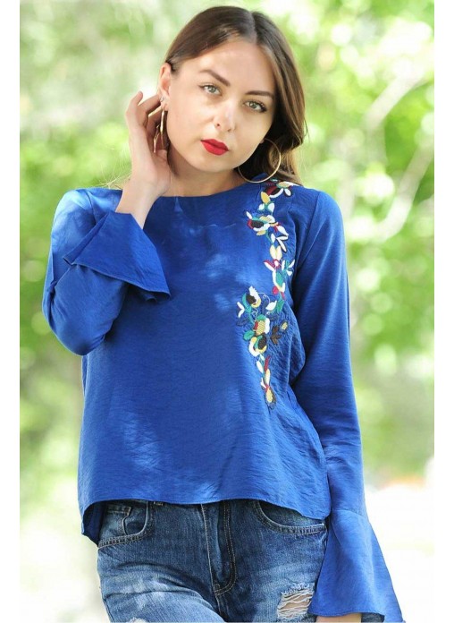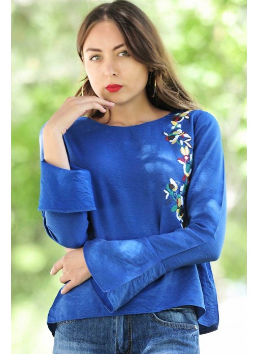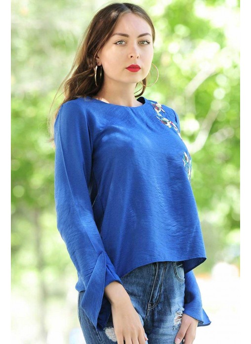 Kolları Salaş Çiçek Motifli Saks Mavisi Bluz