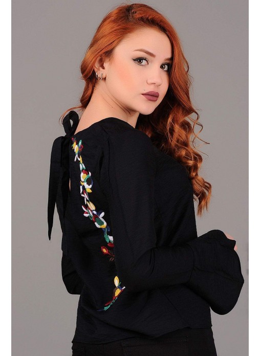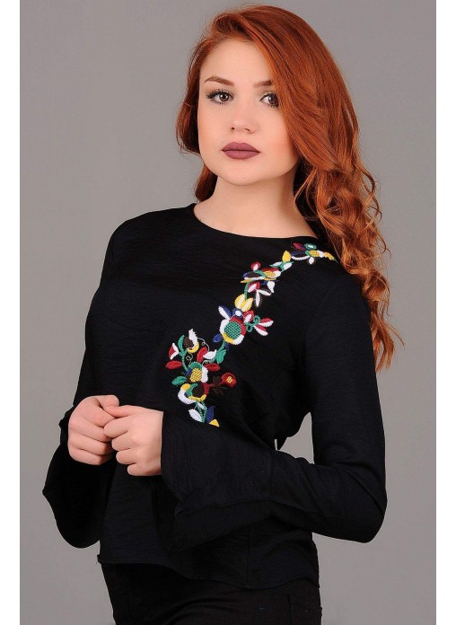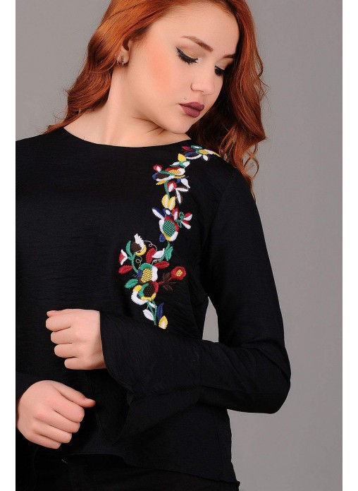 Kolları Salaş Çiçek Motifli Siyah Bluz