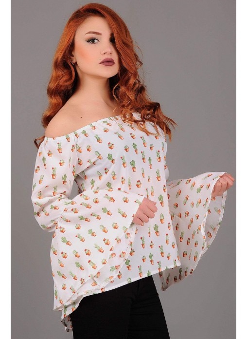 Kolları Salaş Desenli Beyaz Bluz