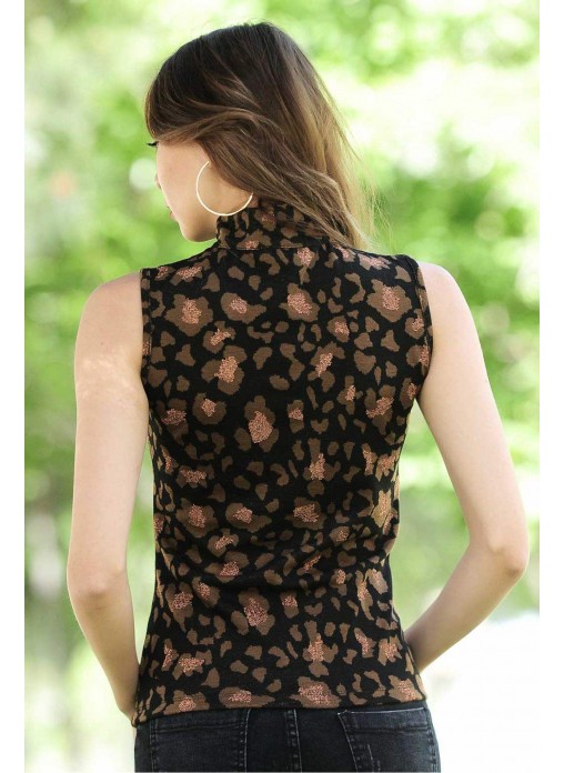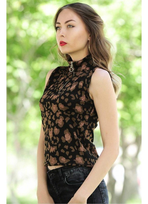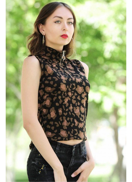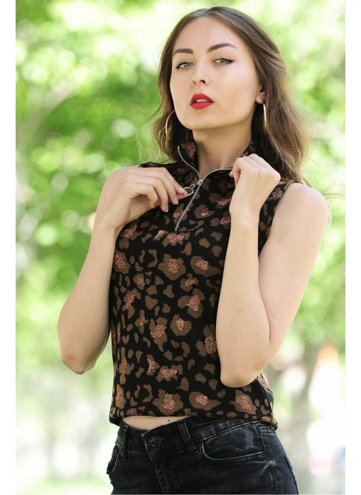 Kolsuz Fermuar Detay Desenli Kahve Siyah Bluz