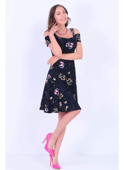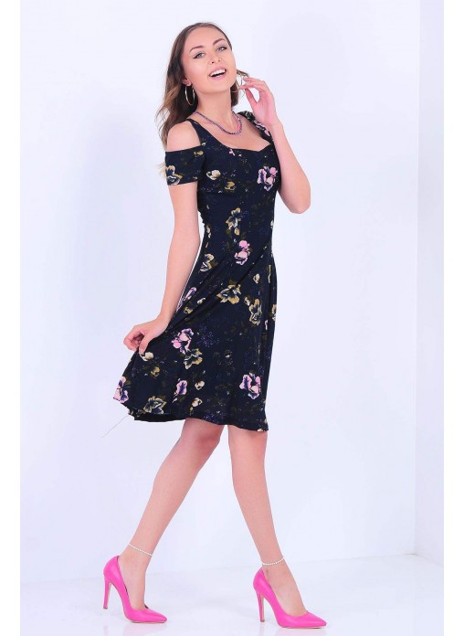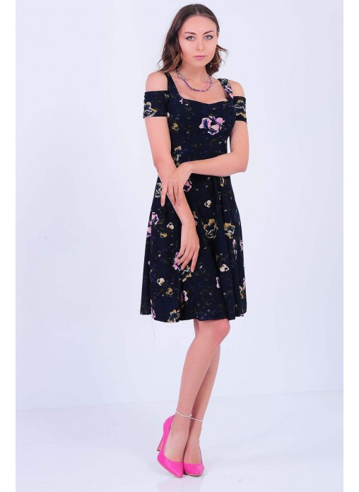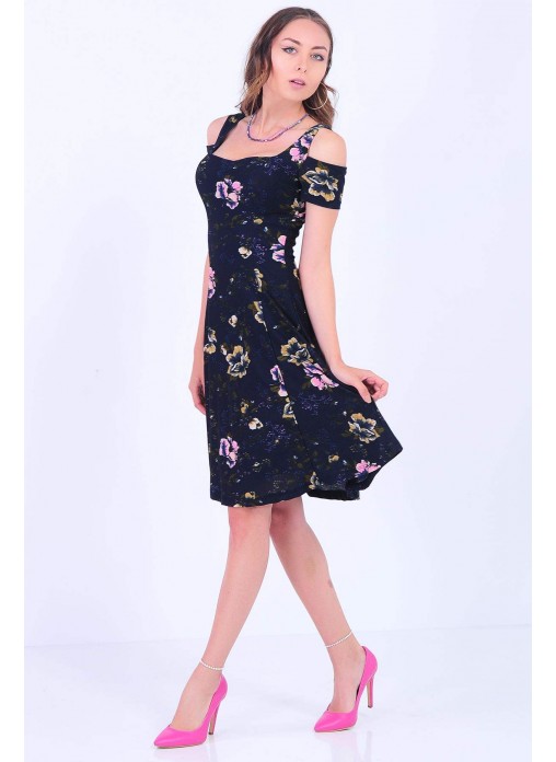 Omuz Açık Çiçek Desenli Geniş Etek Lacivert Elbise