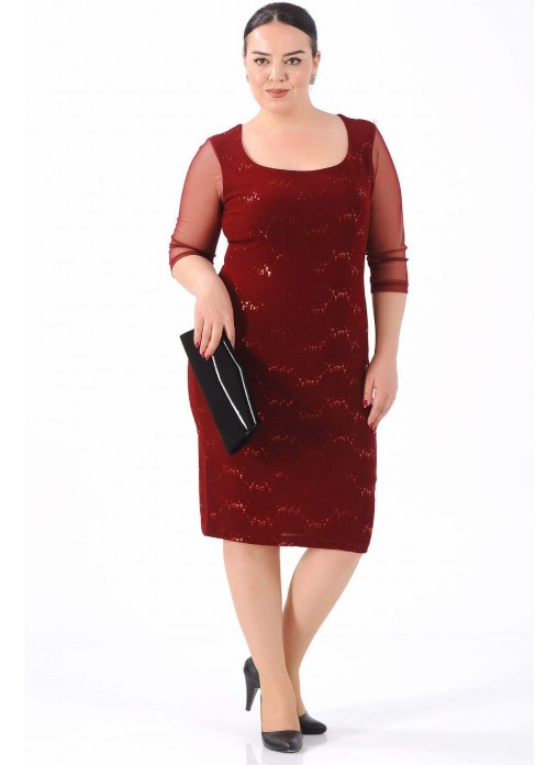 Pullu Payetli Tül Kol Büyük Beden Bordo Elbise