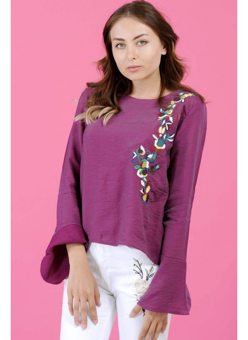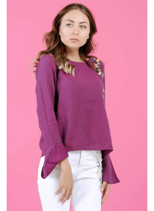 Sırtı Çiçek Desenli Mor Bluz