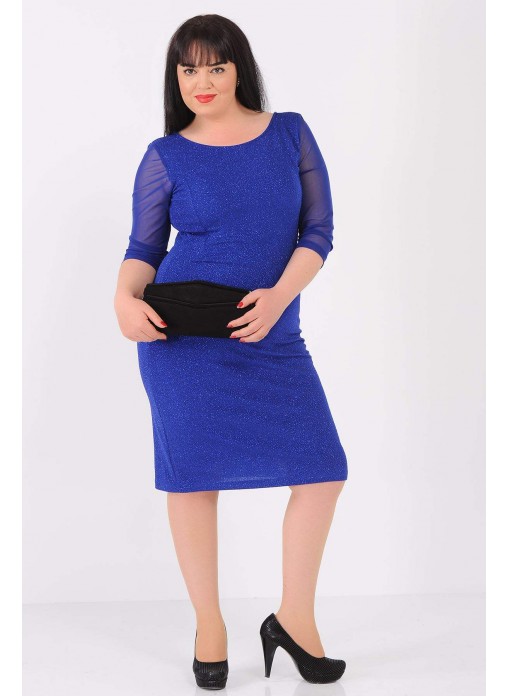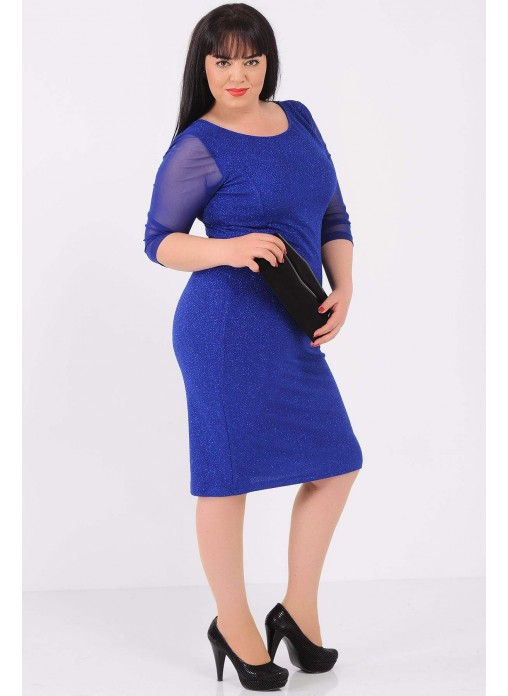 Tül Kol Simli Büyük Beden Saks Mavisi Elbise