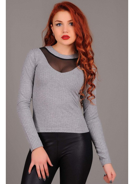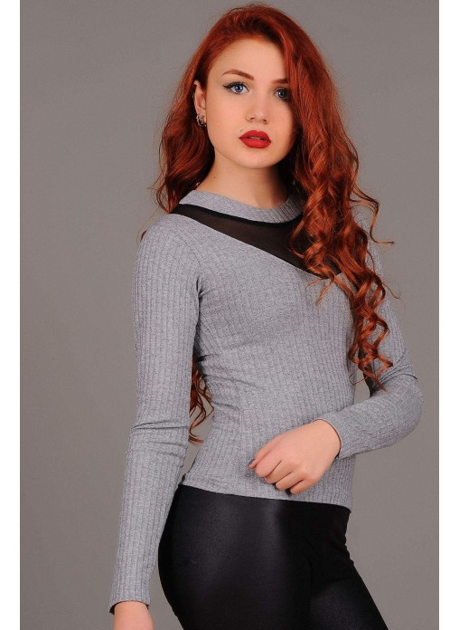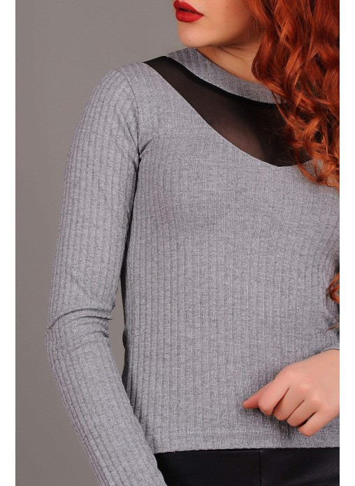 Tül Yaka Gri Bluz