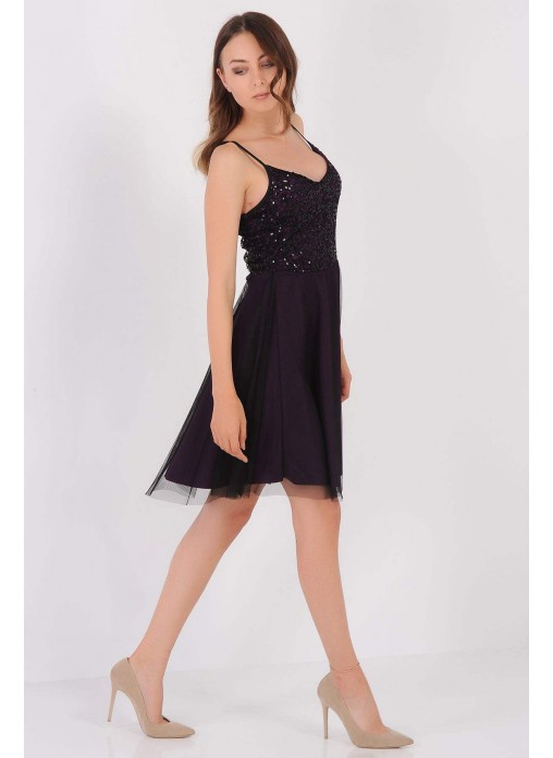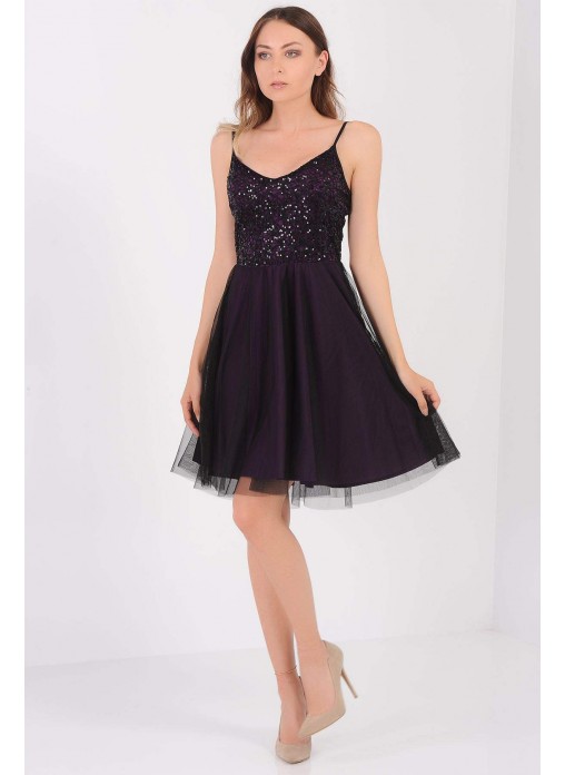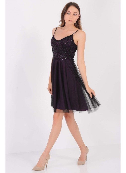 Kesim Tipi : Üstü Pullu Askılı Mürdüm Elbise