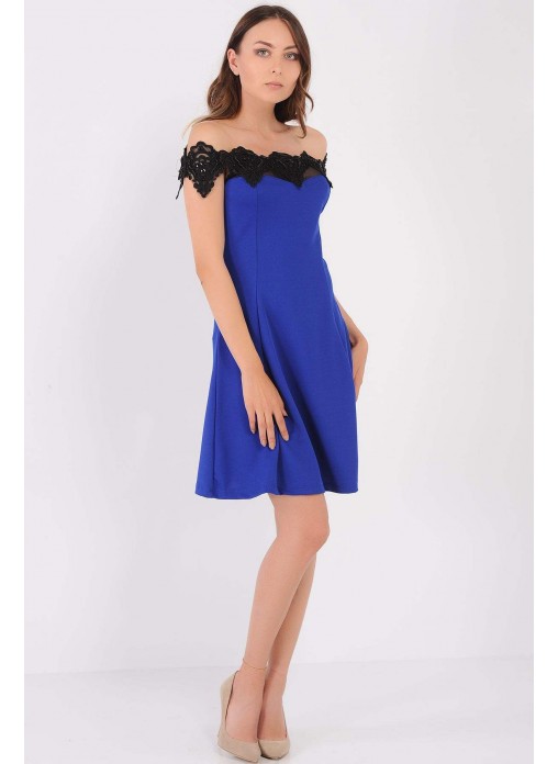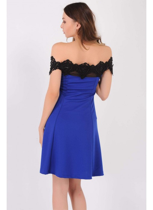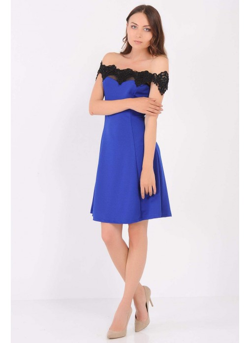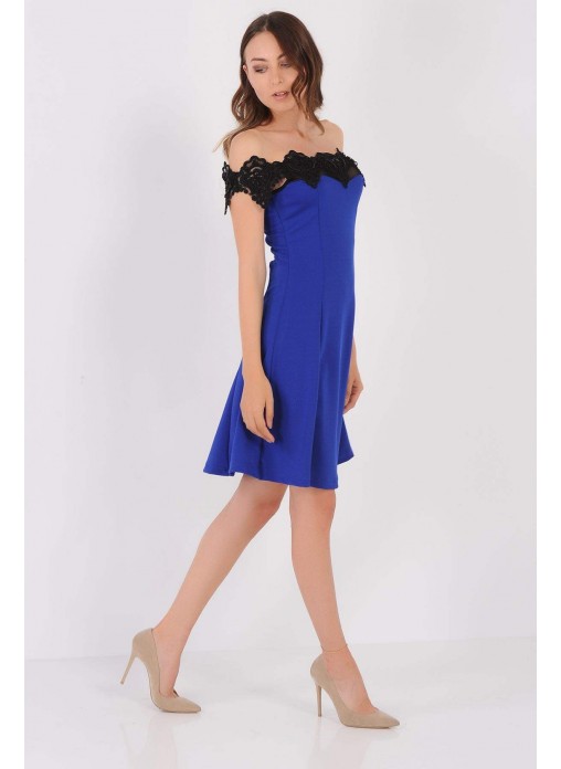 Kesim Tipi : Yakası Boncuk Dantel Geniş Etek Saks Mavisi Elbise