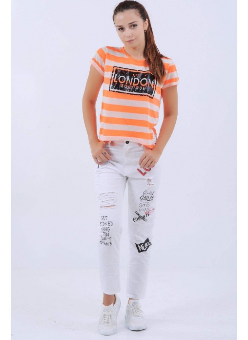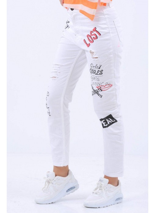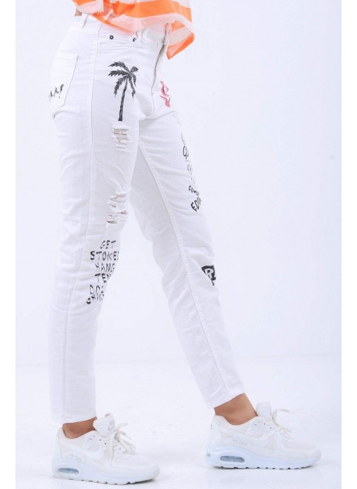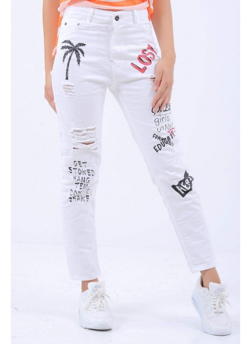 Baskılı Kesikli Beyaz Denim